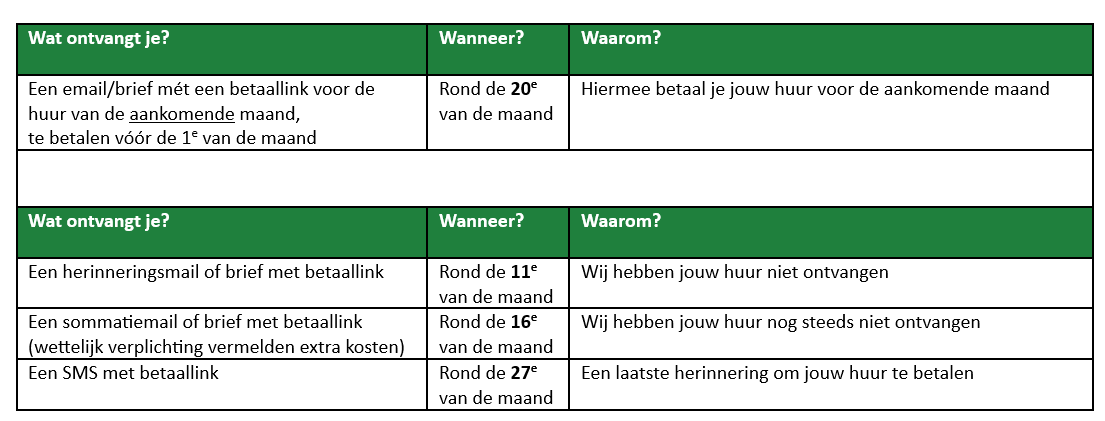 Betaal je jouw huur nu via een automatisch incasso, dan incasseren wij maandelijks de huur van jouw bankrekening. Alléén indien dat niet lukt, omdat er bijvoorbeeld onvoldoende saldo op jouw rekening staat, krijg je van ons bericht.