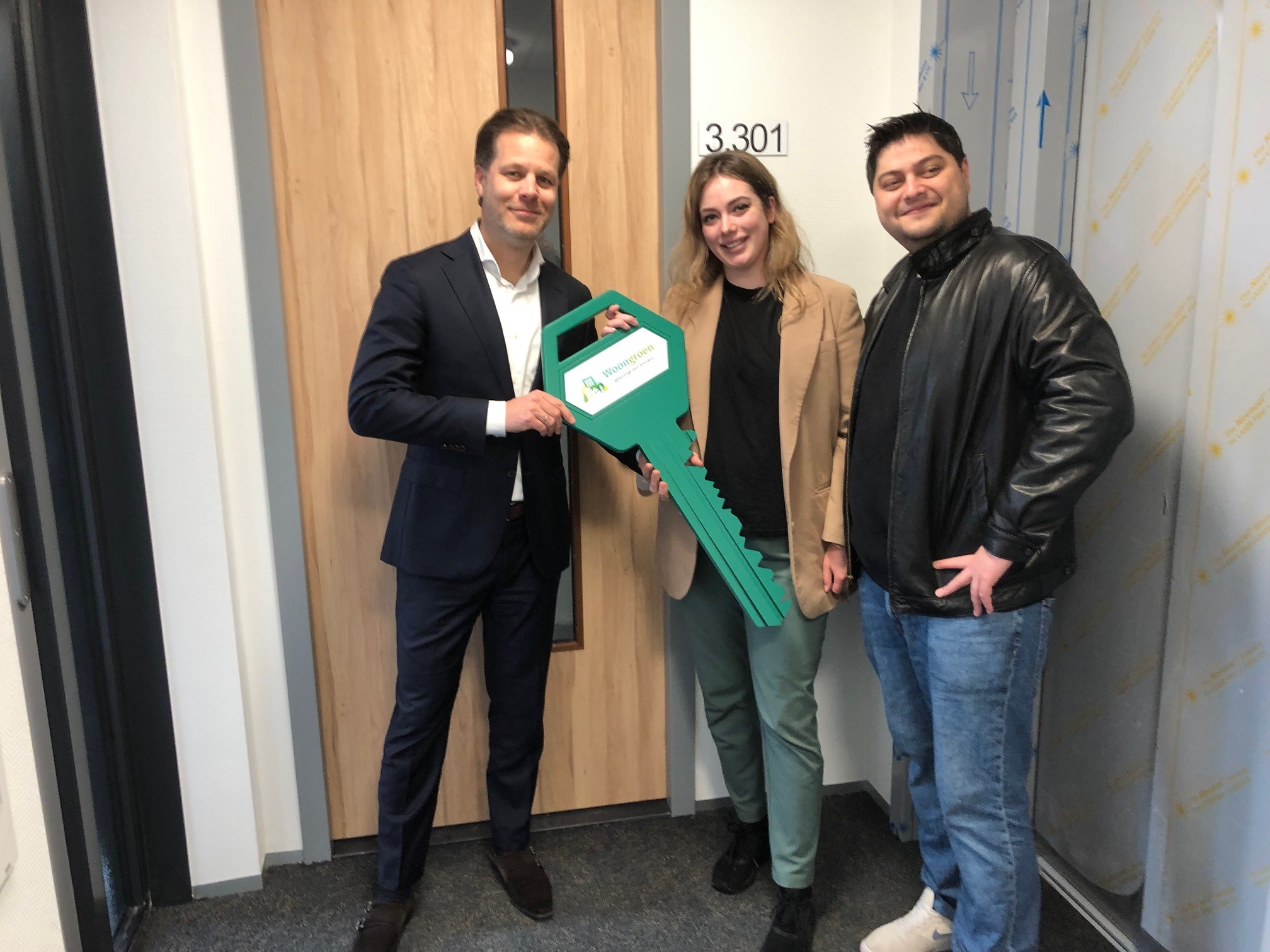 Bestuurder Danny Visser (links) overhandigde symbolisch de eerste sleutel aan de gelukkige nieuwe bewoners.
