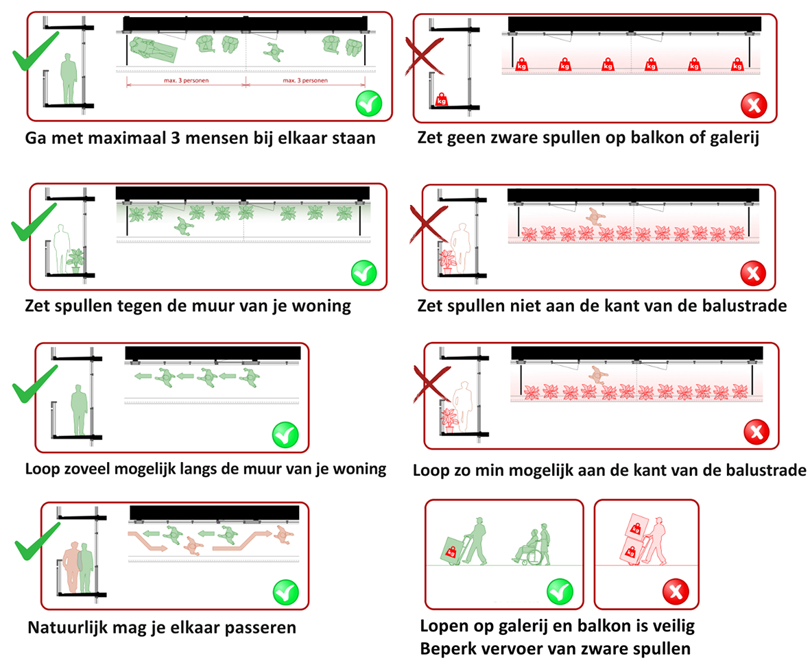 Lopen op de galerij en balkon is veilig. Natuurlijk mag je elkaar passeren op de galerij.