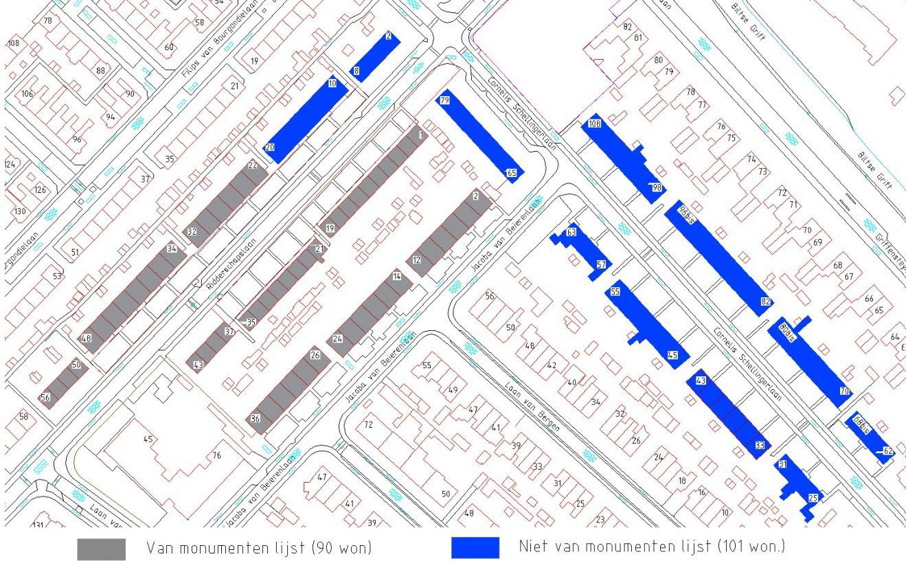 Op het kaartje zie je welke woningen blijven (blauw) en welke worden gesloopt en vervangen voor nieuwbouw (grijs).
