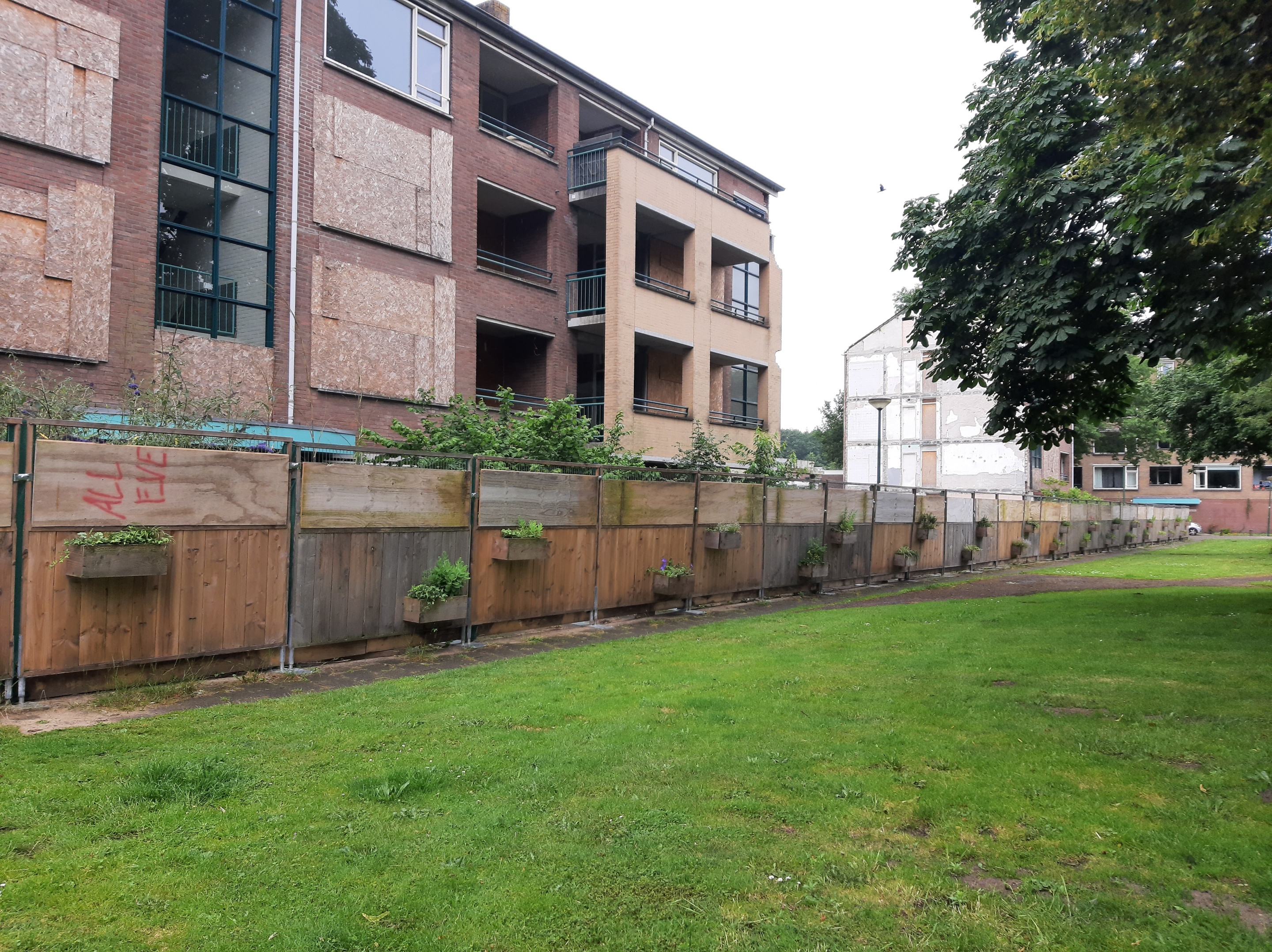 In mei 2024 hebben we de houten schutting die er stond vervangen door een bouwhek met plantenbakken. Dit bouwhek kan ook tijdens de sloop en nieuwbouw blijven staan. Het groen wordt onderhouden in samenwerking met medewerkers van Reinaerde.