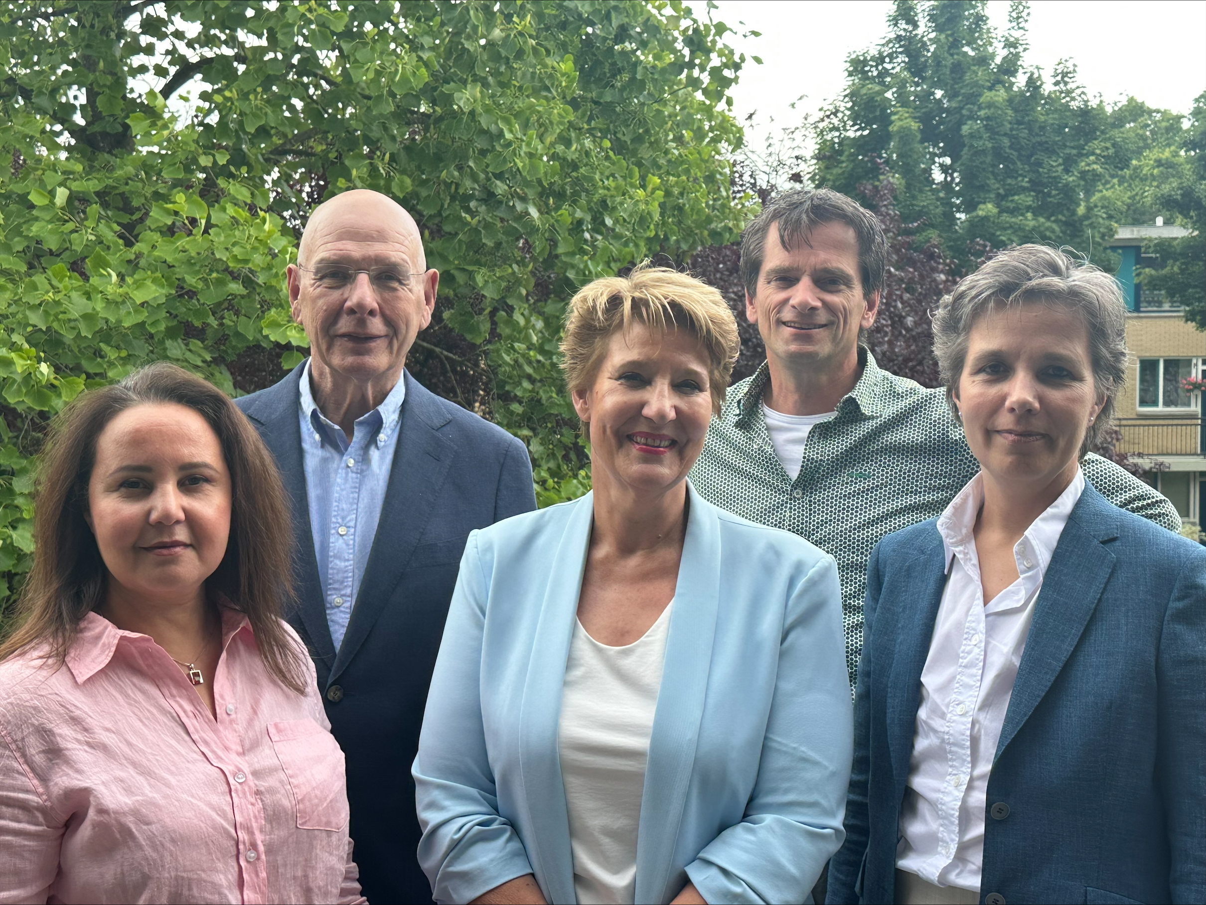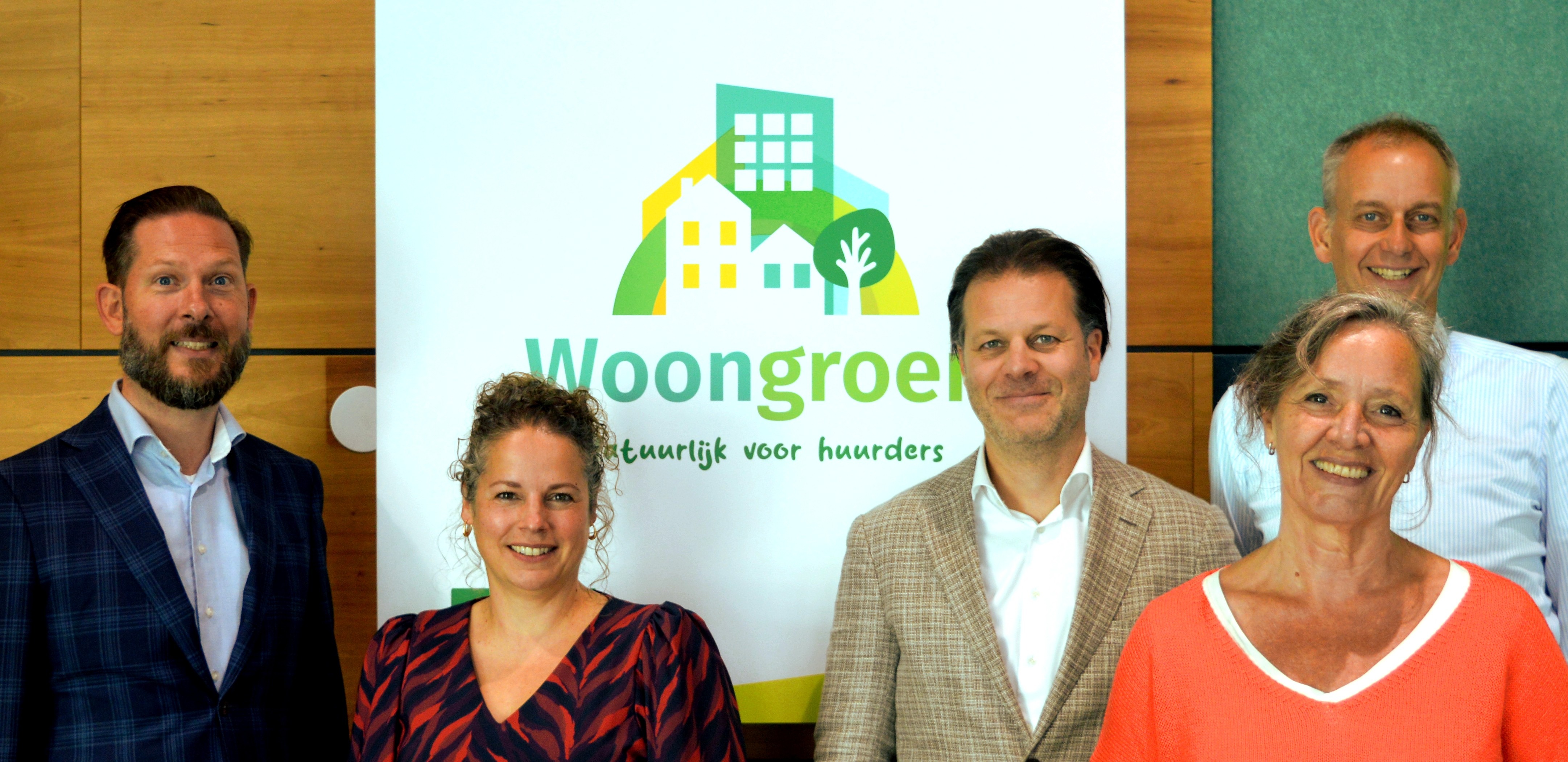 Van links naar rechts: Arjen Groothedde (manager Bedrijfsvoering), Hanneke Burg (manager Wonen), Danny Visser (directeur-bestuurder), Gerda Hullegien (manager Wonen) en Emile Driesen (manager Vastgoed).