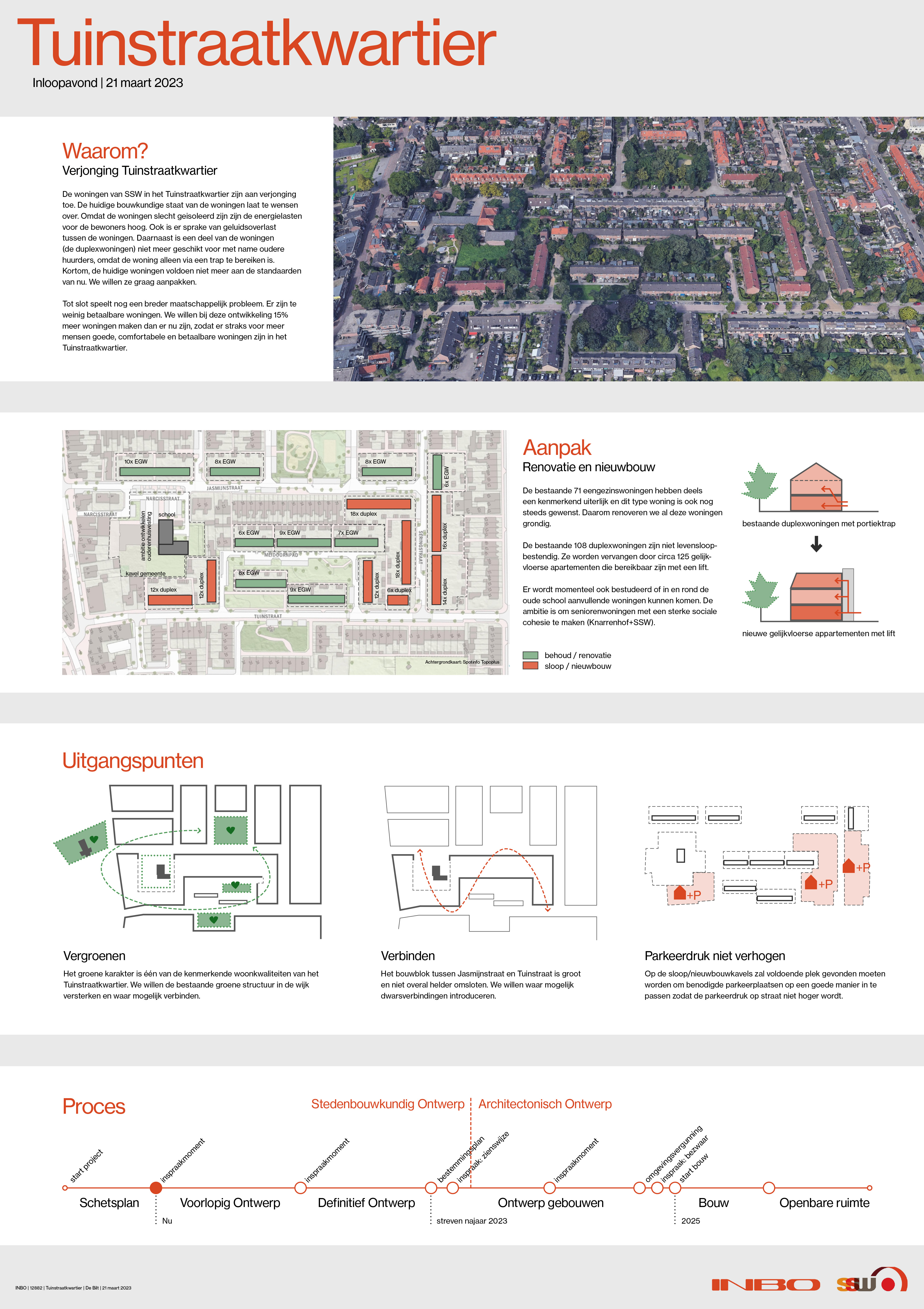 Bewoners, omwonenden en andere belangstellenden hebben tijdens diverse inloopbijeenkomsten en via werkgroepen meegedacht over het schetsontwerp voor de nieuwe woningen en het groen in de wijk. Het stedenbouwkundig ontwerp is gemaakt en in november 2024 vastgesteld door de gemeenteraad. Dit plan is nog niet herroepelijk, daarvoor is een procedure in de Raad van State nodig.